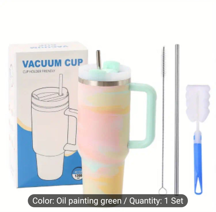 1pc Stainless Steel Insulated Travel Mug Set – Large-Capacity Vacuum Tumbler with Handle, Lid, Straw & Cleaning Brush