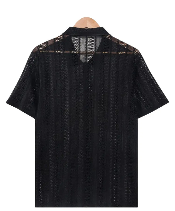 Men's Stylish Black Mesh Short-Sleeve Button-Up Shirt – Summer Casual Knitwear