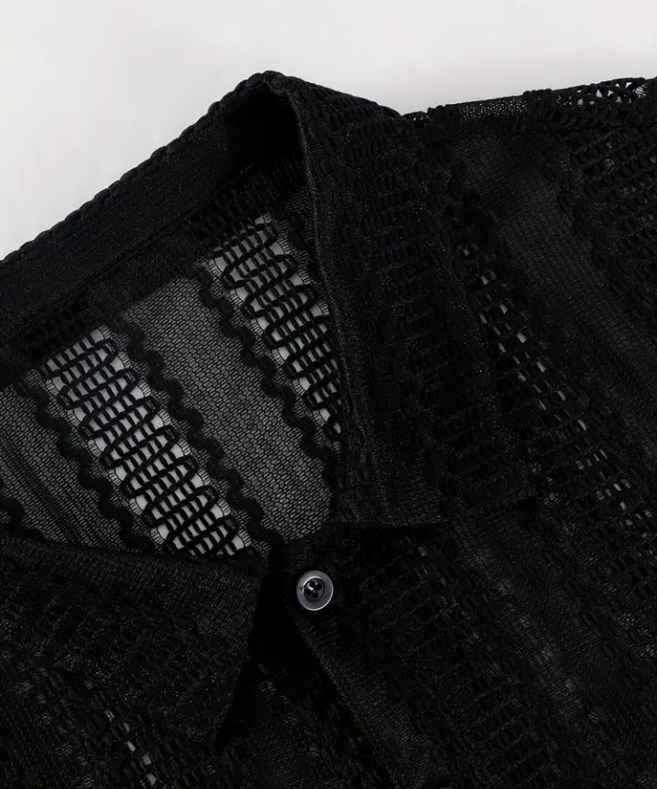 Style cool and look sharp with this Men's Stylish Black Mesh Short-Sleeve Button-Up Shirt, designed for the modern man who values breathable comfort and standout fashion. Made with a lightweight knit construction featuring a trendy openwork mesh design, this shirt combines ventilation and style, making it a must-have for summer casualwear.